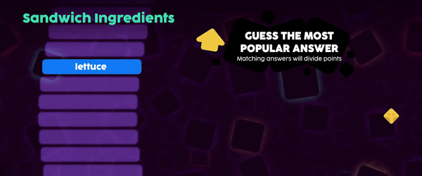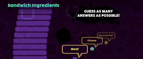 Bounce: In Bounce, two teams control a paddle that sits on a scale between most popular-to-least popular answers. Work with your team to guess an answer that puts your paddle in the right place to intercept a bouncing ball and stop your opponents from scoring a goal! But be careful! The ball gets faster with each answer!